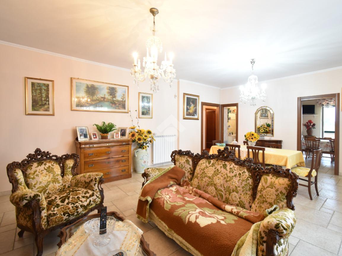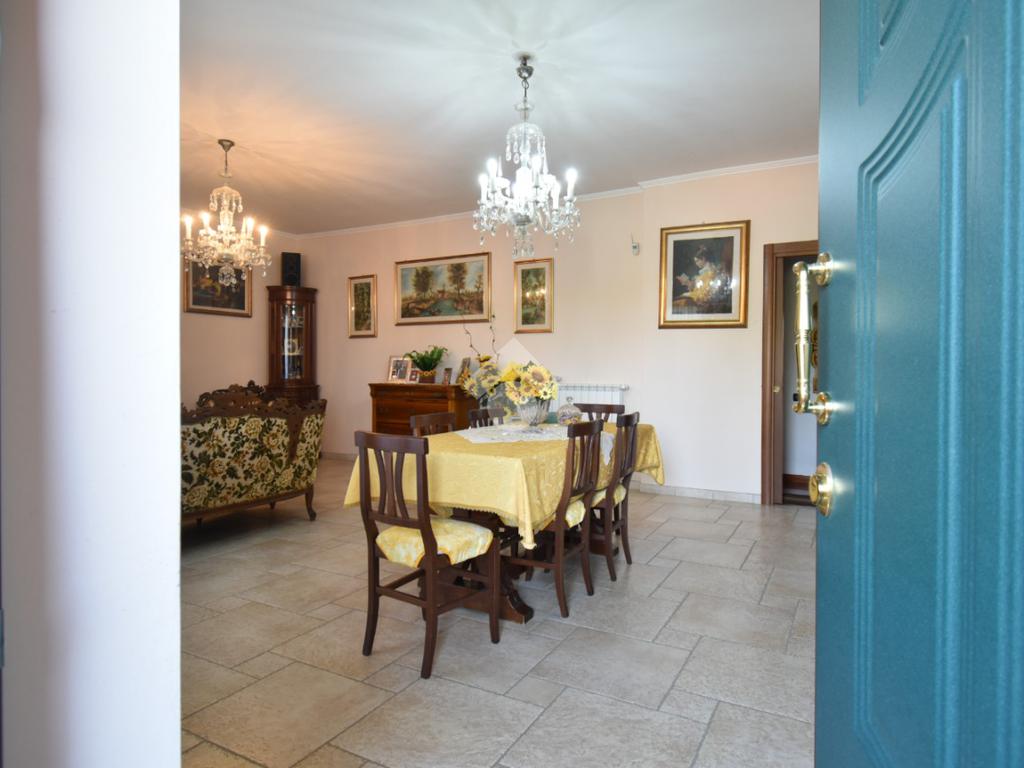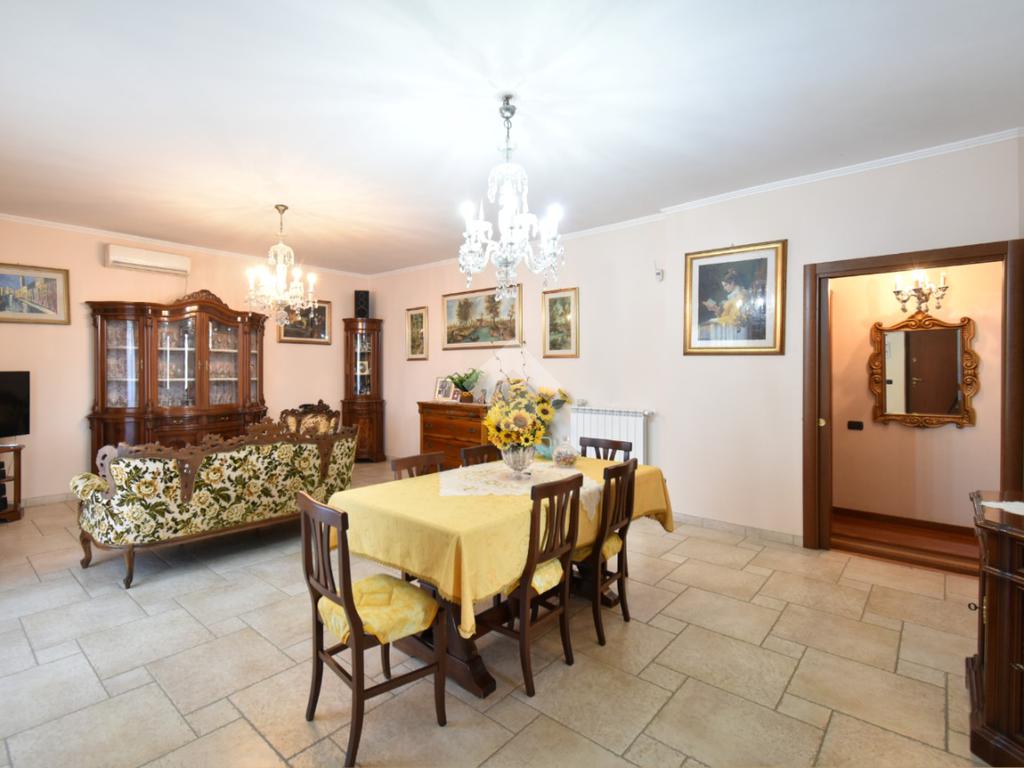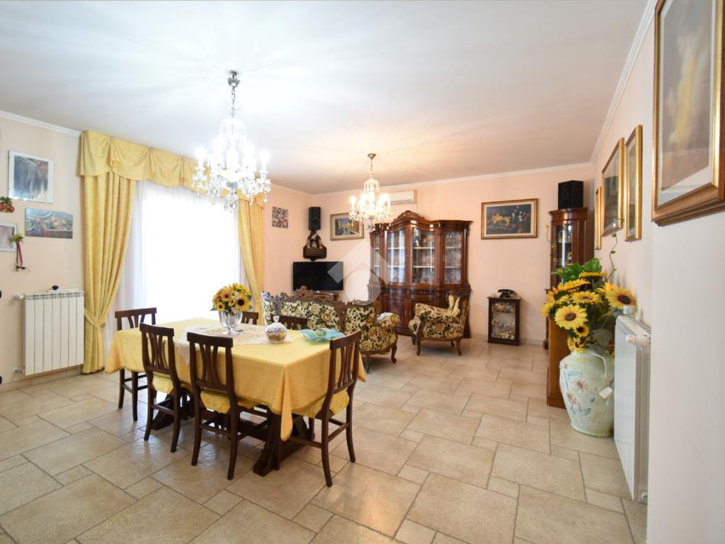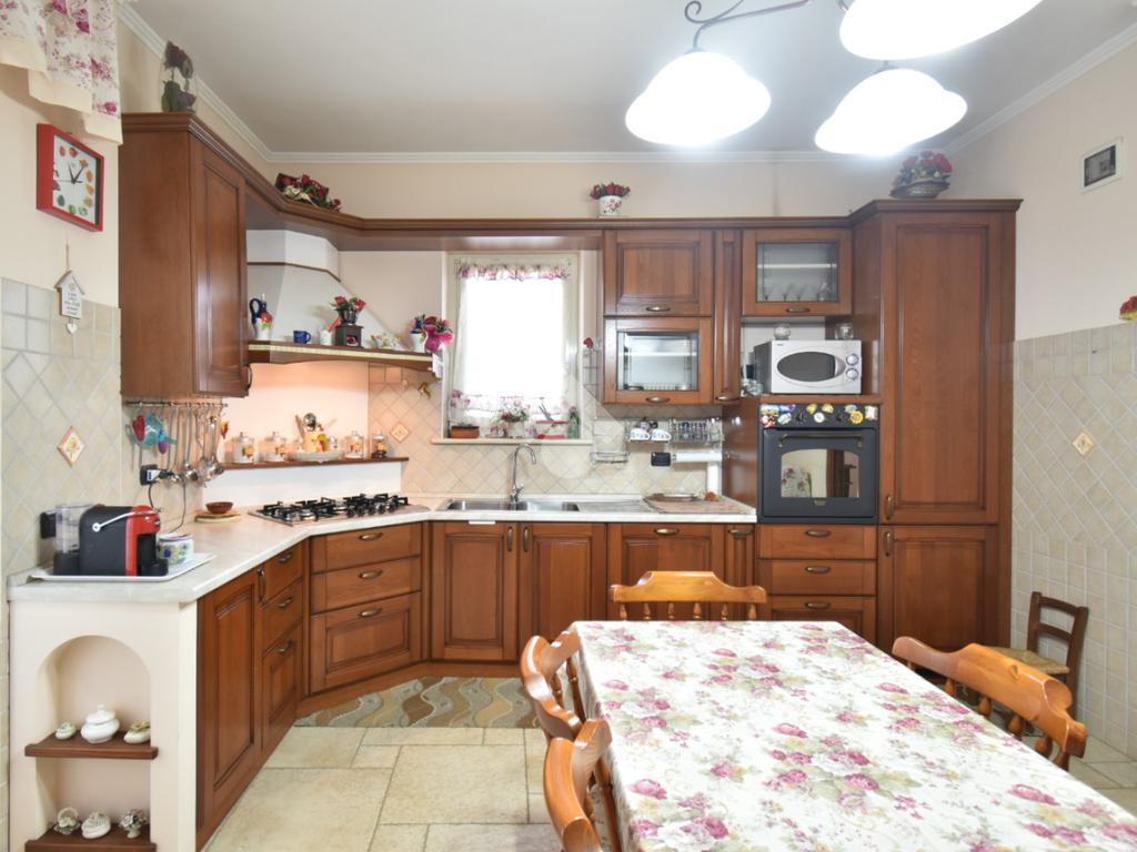 L’ingresso alla villa si compone di un cancello pedonale e di un cancello carrabile automatico. Da qui ci accoglie la corte e l'ampio giardino, una scalinata ci accompagna al portone blindato attraversato il quale ci troviamo immediatamente nell’ampio salone completo di zona pranzo e una cucina abitabile separata che ha accesso sul balcone coperto.